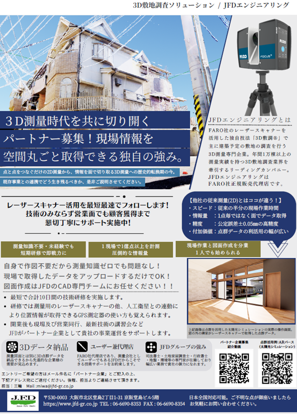 当社中核事業子会社の、株式会社JFDエンジニアリング(本社:大阪市北区、代表取締役CEO:吉田 慶祐)は、日本工業出版『住まいとでんき』の2024年12月号にて、「点群データを民主化するツール 3D敷調」というTOPCSで掲載されました。