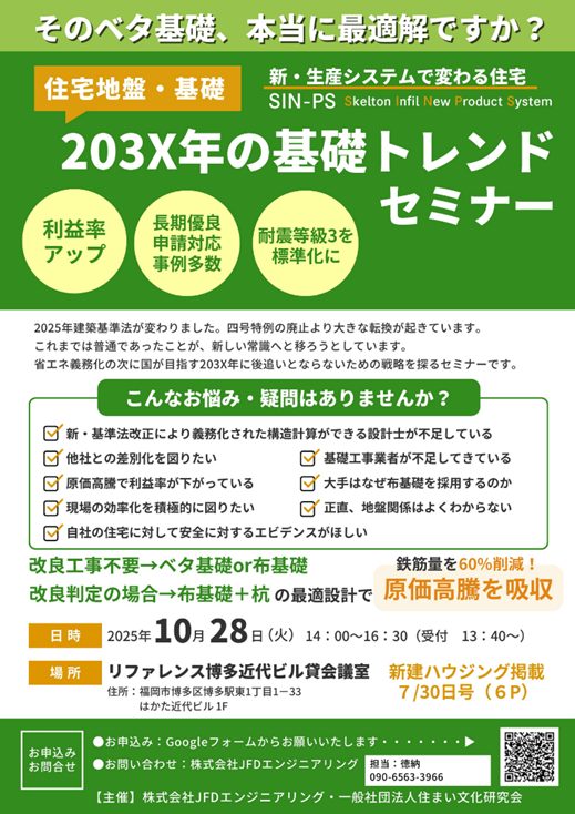 当社:株式会社JFDエンジニアリング(本社:大阪市北区、代表取締役CEO:吉田 慶祐)は2025年10月28日、「一般社団法人住まい文化研究」と「一般社団法人不動産検査保証機構」と共同で『住宅地盤・基礎 203X年の基礎トレンドセミナー』を開催致しました。